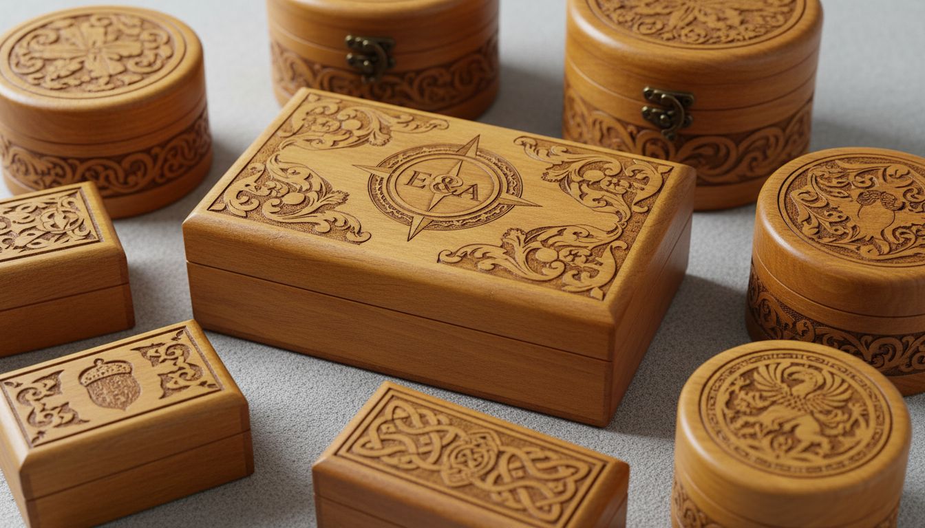 Tiefengravur in Holz: Eine tiefe Gravur in einer edlen Holzkiste vermittelt Beständigkeit und Wertigkeit, die mit Druck nicht erreicht werden kann.